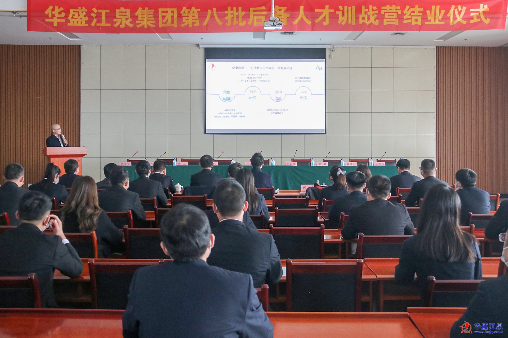 付冬明在儀式上宣讀《關(guān)于華盛江泉集團(tuán)第八批后備人才結(jié)業(yè)的決定》,宣布對(duì)孟子程、李德麗等28名后備人才給予正式結(jié)業(yè)。付冬明指出,為貫徹落實(shí)華盛江泉集團(tuán)人才建設(shè)的相關(guān)要求,為集團(tuán)可持續(xù)發(fā)展儲(chǔ)備各類(lèi)生產(chǎn)經(jīng)營(yíng)管理人才,集團(tuán)開(kāi)展了第八批后備人才的選拔培養(yǎng)活動(dòng),經(jīng)過(guò)嚴(yán)格的筆試、面試最終28人通過(guò)選拔。培訓(xùn)期間學(xué)員嚴(yán)格遵守培訓(xùn)紀(jì)律,認(rèn)真進(jìn)行學(xué)習(xí)研究,所有培訓(xùn)任務(wù)均已按計(jì)劃保質(zhì)保量完成。后備人才是促進(jìn)集團(tuán)公司發(fā)展的中堅(jiān)力量,也是人才隊(duì)伍建設(shè)的重要組成部分,他希望歷屆后備人才要珍愛(ài)企業(yè)、夯實(shí)基礎(chǔ)、厚積薄發(fā)、勇于創(chuàng)新,攜手共創(chuàng)華盛江泉的美好未來(lái)。